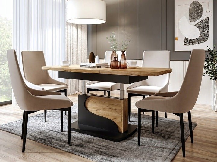 Stalas transformeris pagamintas iš aukštos kokybės laminuotos plokštės , kurios storis 18 mm . Viršutinė dalis storinta net 36 mm. Stalviršio kraštai apdailinti PVC kraštu, apsaugančiu elementus nuo mechaninių pažeidimų. Stalas turi išskleidimo ir pakėlimo funkciją. Stalą transformerį labai lengva prižiūrėti ir valyti. Valymui tinka, bet kuri neagresyvi priežiūros priemonė skirta laminuotai plokštei. Tai ypatingai kokybiškas stalas kuris tarnaus ilgus dešimtmečius.