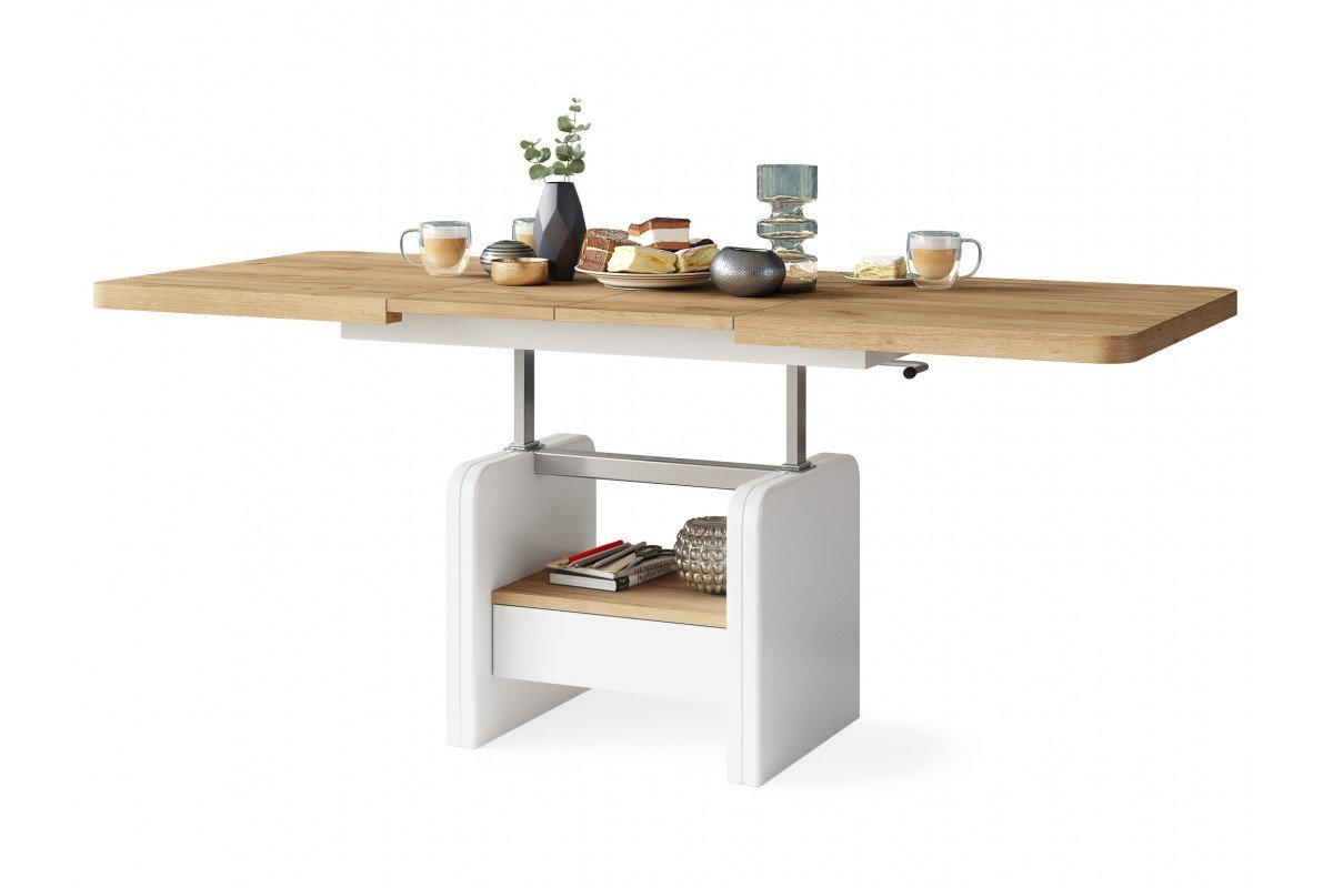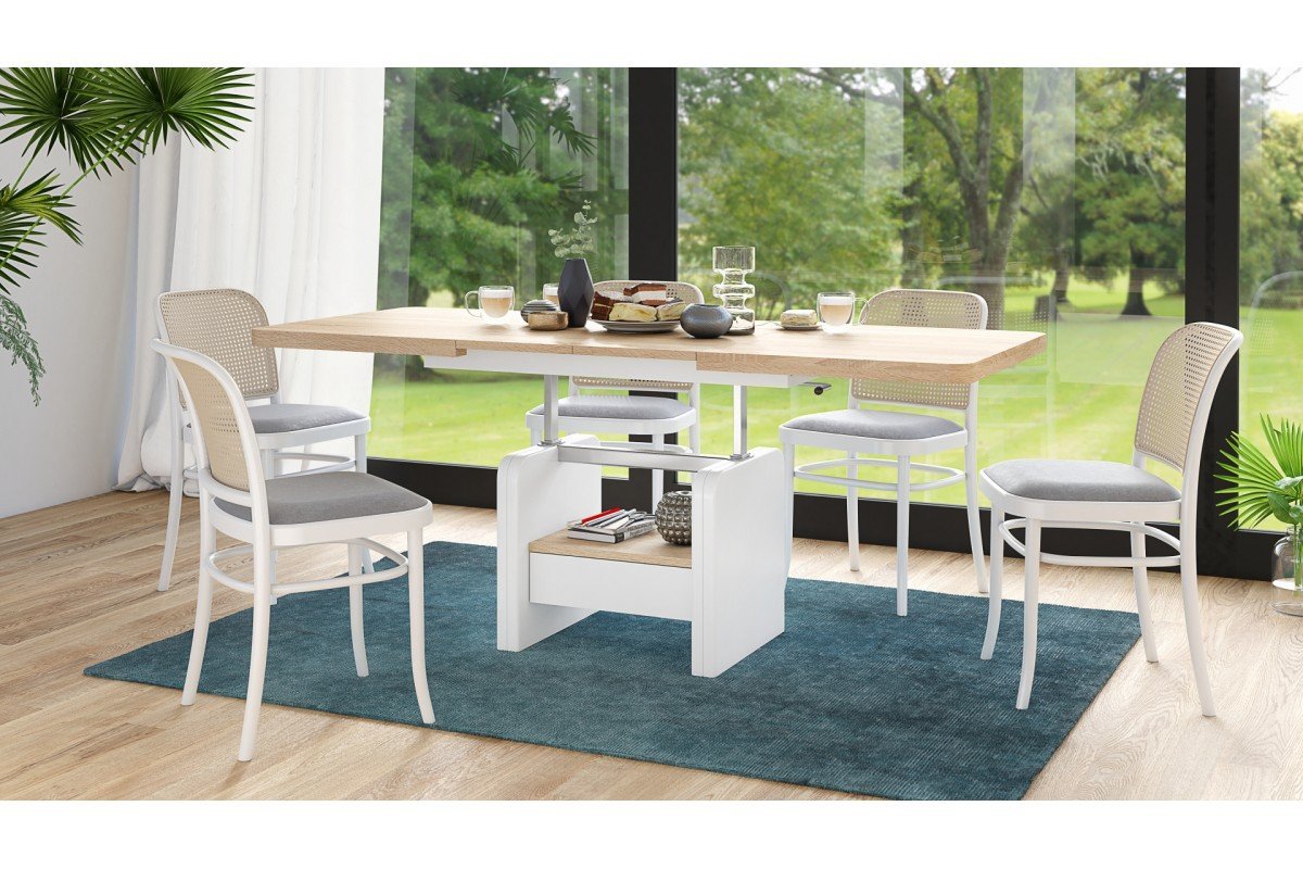Stalas pagamintas iš 18 mm storio matinės medžio drožlių plokštės (laminuotos iš abiejų pusių) ir dvigubos 28 mm storio dažytos MDF plokštės (kojos). Visa apdaila su 2 mm ABS briauna. Be to, stalviršis turi iki 36 mm storintą šoną bei 2 įdėklus, kuriais galite keisti stalo ilgį. Aukštos kokybės milteliniu metodu dengta stalo kėlimo įranga užtikrina lengvą ir patogų stalviršio išskleidimą. Stalą transformerį labai lengva prižiūrėti ir valyti. Valymui tinka, bet kuri neagresyvi priežiūros priemonė skirta laminuotai plokštei.